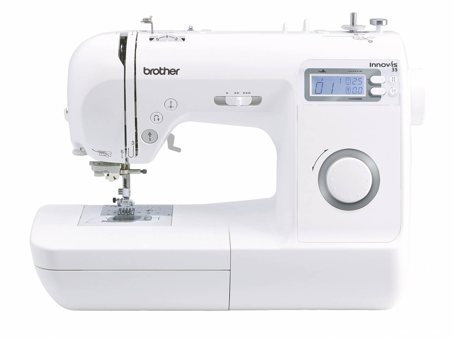 Een nette computergestuurde naaimachine uit de bekende Innov-Is reeks van Brother. De hier aangeboden Brother Innov-Is 35 naaimachine bieden wij compleet aan. De NV-35 wordt geleverd met harde beschermkap, Nederlandstalige handleiding, voetpedaal, netsnoer, knoopsgatvoetje, knoop-aannaaivoetje, overlockvoetje, blindzoomvoetje, naaivoet voor decoratieve steken, ritsvoetje, 4 x originele Brother spoeltjes, tornmesje, garenschijfjes, borsteltje, garennetje, doosje naalden (assorti), en een tweelingnaald.